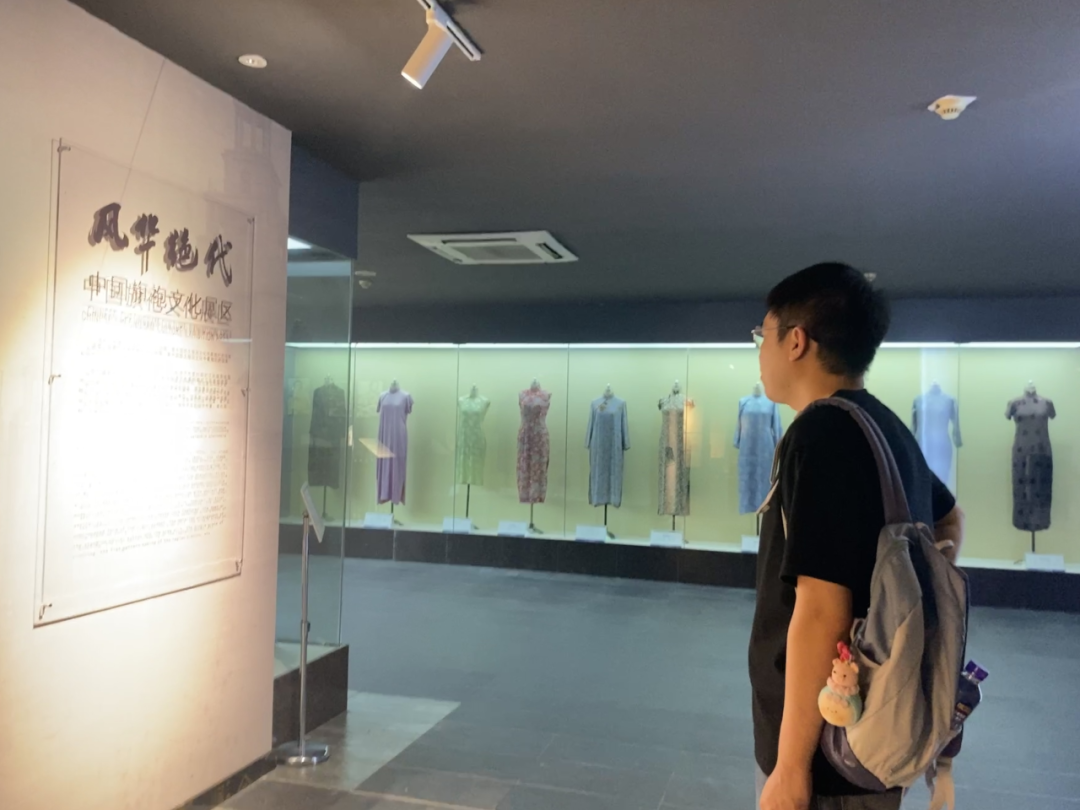 “一晃十几年没回来,博物馆的展品丰富度、专业度,比我们上学时真的提升太多了!”刚踏入博物馆展厅,刘宝的目光便被陈列的展品牢牢吸引,语气里满是惊喜与感慨。漫步展厅,从承载传统技艺的明清织锦、民国旗袍,融入现代设计理念的校企合作创新作品,再到记录江西本土服饰变迁的地方特色服饰,每一件展品都让他不自觉放慢脚步。他一边凑近玻璃展柜,端详面料纹理与工艺细节,一边拿出手机拍摄记录,不时与陪同老师打开“话匣子”:“上学时我们在课堂上学的是服装营销的理论和技巧,今天在这儿看到的,是服饰从‘实用品’到‘文化载体’的演变,一下子把当年没吃透的‘专业底色’给补上了。”