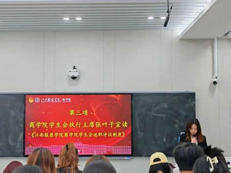 会议第三项,学生会执行主席张叶子宣读《江西服装学院商学院学生会述职评议制度》,从述职内容、评分标准到评议流程进行系统性解读,强调述职评议是检验工作成效、促进自我革新的重要机制,要求以严肃态度确保大会公平公正。