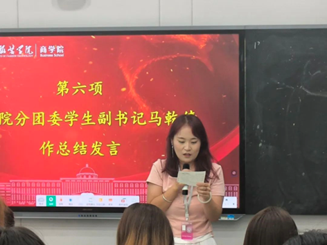 会议第五项,商学院分团委学生副书记马乾倩作总结发言。她充分肯定了各部门本学期的工作成果,指出述职大会不仅是一次工作汇报,更是一次交流学习、反思提升的契机。她强调,学生会成员应始终保持奋斗姿态,在实践中锤炼本领,为商学院的发展贡献青春力量。