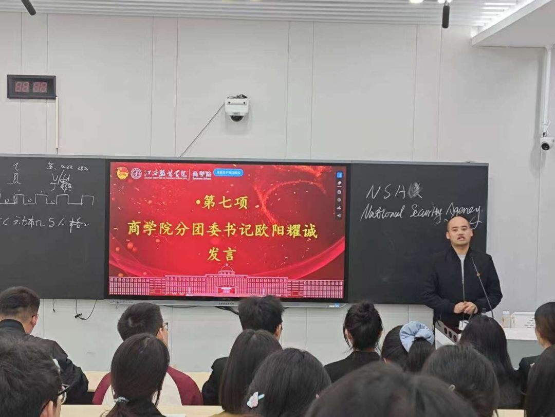 会议第七项,商学院分团委副书记王幸俊和分团委书记欧阳耀诚发言。王幸俊要求各部门强化协作意识,打破壁垒,形成合力,以务实举措和高效联动切实服务同学成长成才,展现学生组织的担当与作为。欧阳耀诚强调全体成员要努力成为“靠谱的合作者”与“清醒的学习者”,并要求大家以高度的责任心协同工作,并在实践中持续学习、保持思考,不断提升履职尽责的能力与水平。