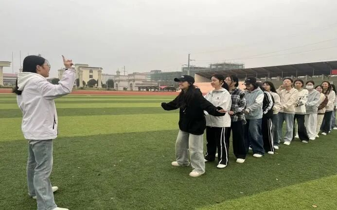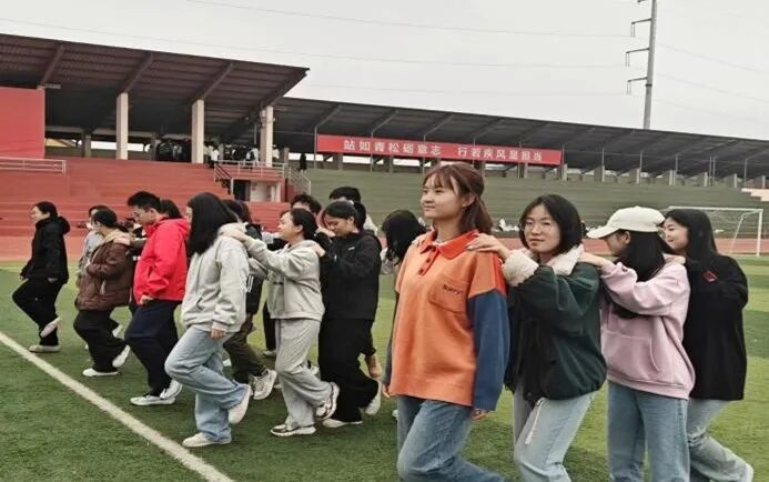最难忘的是“单腿跑火车”的素拓环节,起初,我们小组还能保持节奏,可中途有人步伐没跟上,整支队伍瞬间掉队。短暂的慌乱后,没人抱怨,大家返回起跑线立即调整站位,我们重新手搭前面队友的肩、单脚站立,喊着节拍同步迈进。第二次尝试,每个人都紧跟前方队友的步伐,全力保持平衡,终于顺利完成。
