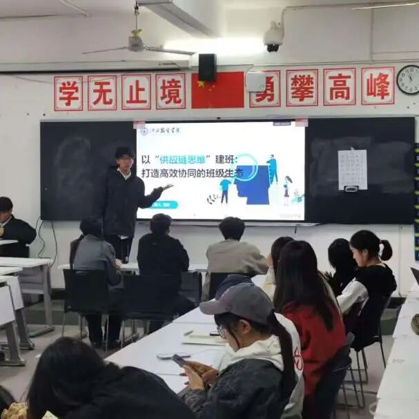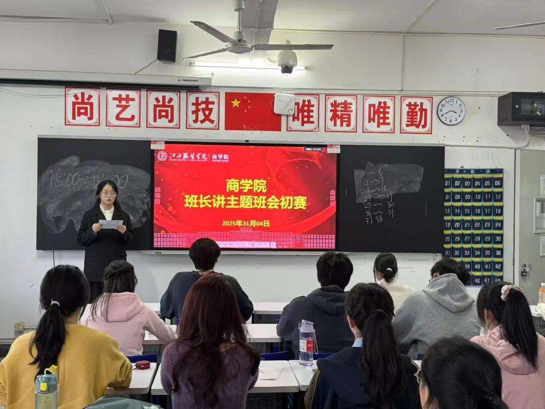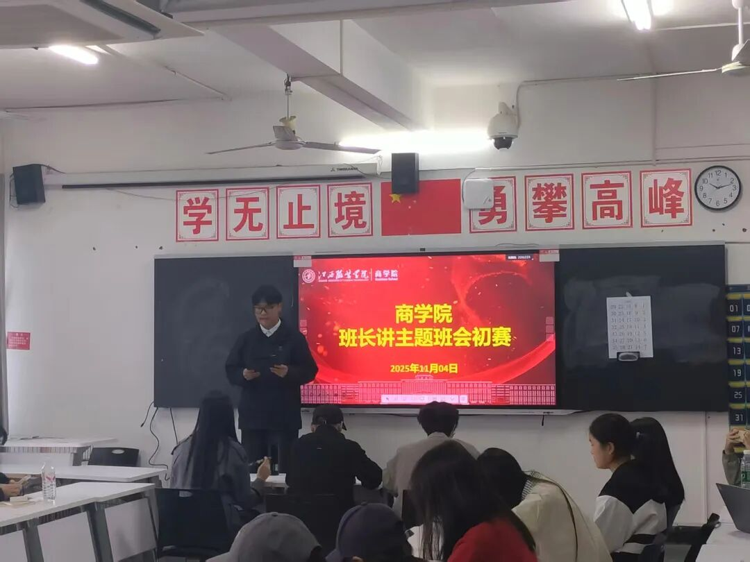 为了促进班长全面发展、提升综合素质,发挥其模范带头作用,江西服装学院商学院于2025年11月4日下午5点在主教学楼511室与411室举办了“班长讲主题班会”初赛。商学院学工办副主任欧阳耀诚,辅导员王幸俊老师以及班委联合会的负责人们出席本次竞赛并担任评委。