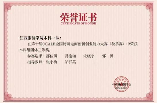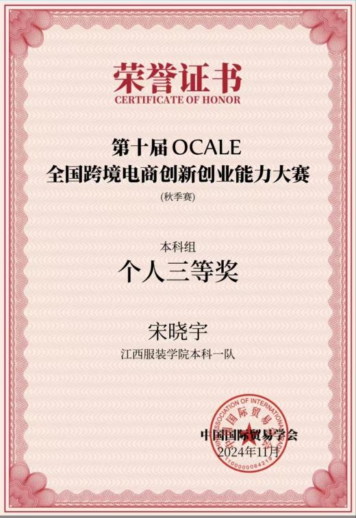 2024年获全国跨境电商创新创业能力大赛个人三等奖、团体赛三等奖
