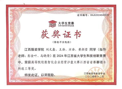 2024年12月获得“江西省高等院校数智化企业经营沙盘大赛”省赛三等奖;
