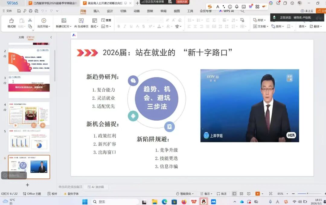 为帮助同学们明晰毕业流程、做好职业规划、从容应对求职挑战,江西服装学院商学院于2026年3月1日在主教楼开展了“就业育人公开课之明晰去向登记,规划职业新程”的主题班会,本次班会旨在强化就业指导,明确发展路径,将压力转化为前行的动力。