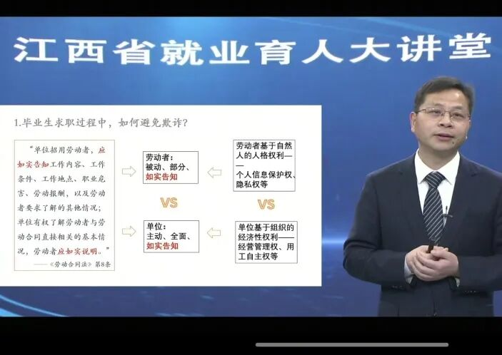本次大讲堂直播课特别邀请了江西农业大学副教授、博士、江西省律师协会劳动与社会保障法专业委员会副主任李孝保担任主讲嘉宾。李孝保老师既是国家一级企业人力资源管理师,又是深耕劳动法律领域的专家,他以《高校毕业生就业中的劳动权益保护》为主题,结合当前就业市场的新业态与新趋势,为同学们带来了一场兼具理论深度与实践温度的专题讲座。